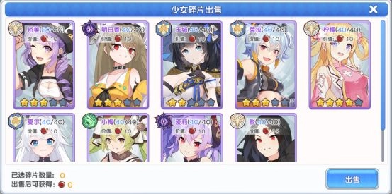 如图所示,紫卡需在角色仓库的右上角位置进行分解操作,40片紫色角色碎片分解后可获得400个少女印章。少女商店中的四个输出型角色没有兑换的必要,建议根据自身需求选择对应的奶妈角色进行兑换。