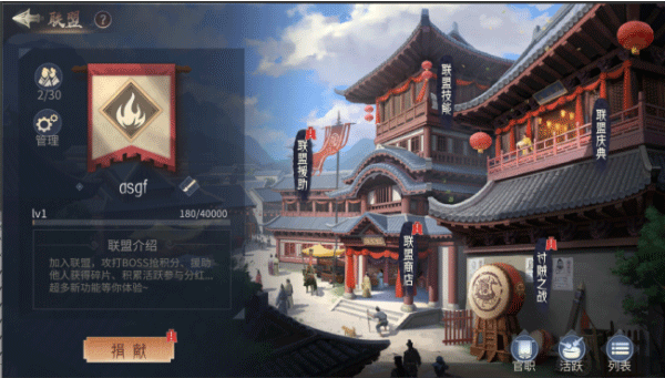 各位主公可以加入联盟,联盟包含联盟援助、联盟商店、联盟技能、联盟庆典、讨贼之战、军团铸像,以及联盟基础的活跃玩法