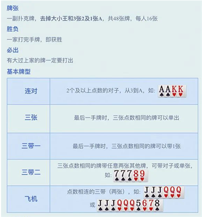 使用48张扑克牌(去掉了大小王、3张2、1张A),开局分别给每人发16张牌。