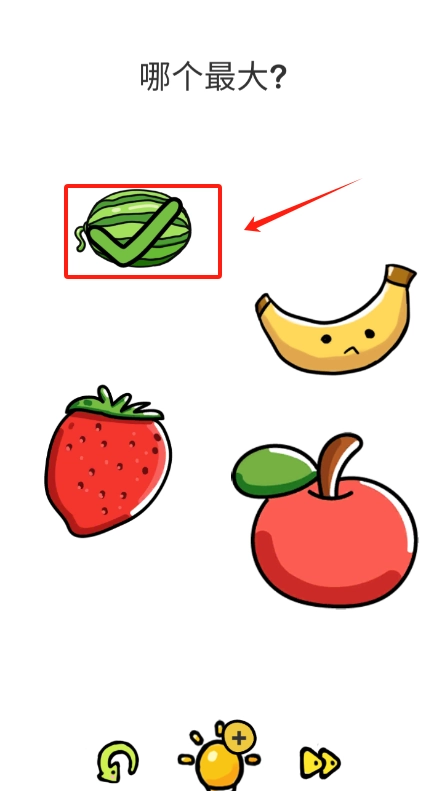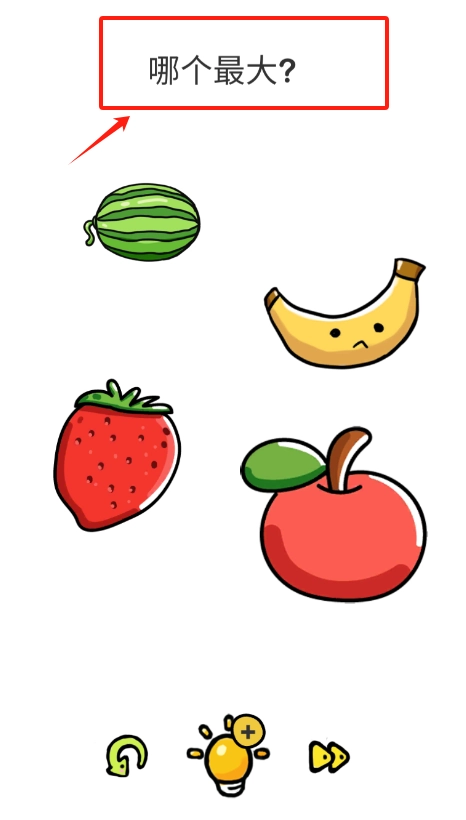 2、留意到四种水果下方有三个小图标,此时用手指点击中间那个带有加号的灯泡图标,或许就能获取有关比较水果大小的提示。