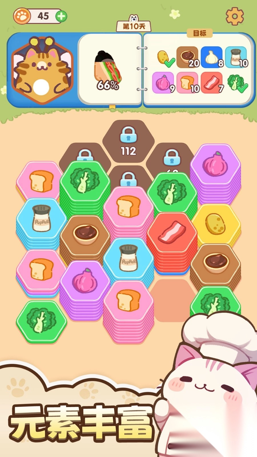烧脑六边形是一款超有趣的消除类游戏。在独特场景里,玩家要迎接消除挑战,助力猫咪大厨化解各类难题。游戏中可自由挪动各种美食,把相同的美食连接起来就能消除,在这过程中不断提高自身消除速度,以更快的速度完成充满趣味的挑战。当遇到困境时,还能借助各种道具摆脱,轻松体验各式各样的消除玩法,每一个关卡都能带来欢乐感受。
