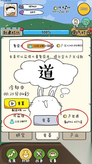 上面我们已经讲过这就是个玩数字翻倍的游戏,变革是金币跨越万倍“数量级”最重要的途径,其他发展和研究都是在本数量级内的2-10倍翻倍,因为随着每一次升级基本都是一个“数量级”,只有变革才能升级,上图繁荣度是金币翻倍的基础,当前越高的金币收益速度直接影响当前获取繁荣度的速度,同时影响产出倍数,所以,在每次变革之前要关注的是右下角这个圈内的倍数,正常重置刷新最低也要200倍,如果是等2.5小时自动刷新倍数要翻1000-2000倍!