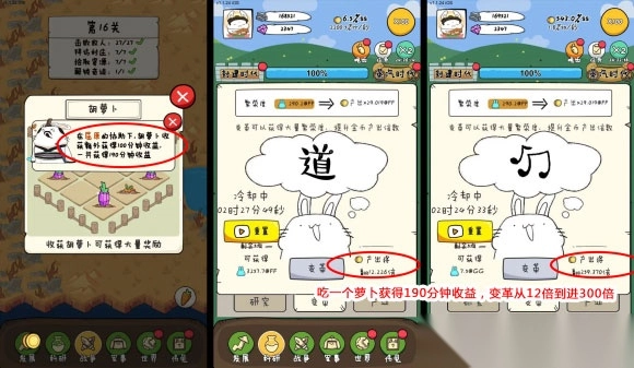 做完以上动作,就要找萝卜了,战争、早晚餐、世界中的周末神兽挑战都可以获得不同时间段的金币收益,同时也会增加繁荣度推高翻倍率,萝卜不能连续吃,要吃一个变革一次,或者神兽挑战一次变革一次,不要连续吃或者连续挑战,原理就是比如吃一个萝卜翻倍300倍,连续吃两个就是加法600倍,吃一个变革一次就是乘法300*300=90000倍