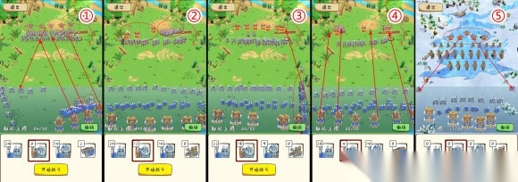 ④:常见的防守阵型,由步兵、弓兵与重弩组成三条战线,往往在敌人技能尚未发动时,我方兵力就已死伤大半。