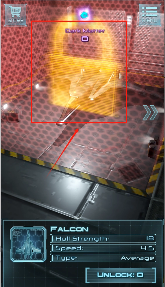 2、在画面中间偏上的位置,有一个黄色的发光挂锁图标,上面写着“Dark Matter”。此图标下方展示了飞船FALCON的相关信息,具体为:船体强度18,速度4.5,类型为普通,解锁数量为0。