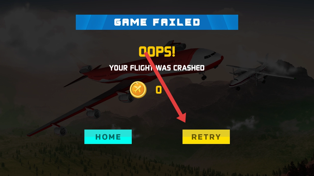 3、若在起飞前碰到其他的障碍物则失败,点击界面右侧RETRY的按钮,重新尝试完成飞行挑战。