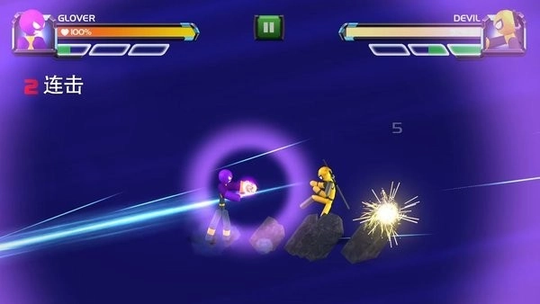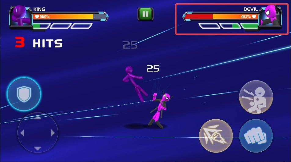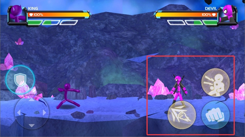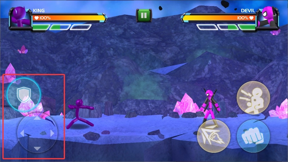 1、进入对战界面后,左侧虚拟摇杆控制火柴人移动走位,下方格挡键可防御对手的强力攻击。