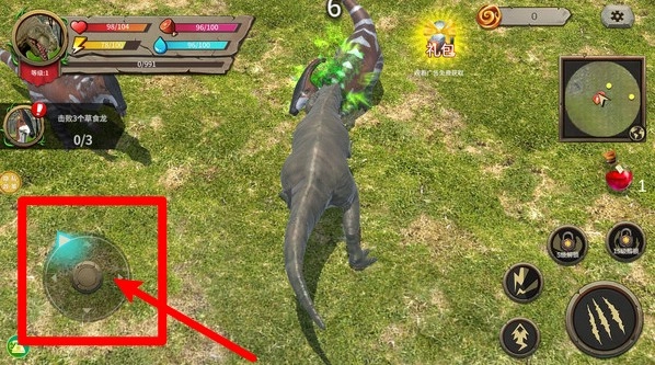 3.左下角的圆形虚拟摇杆用于控制霸王龙移动方向,搭配右侧攻击技能按钮可以灵活走位并快速追击目标