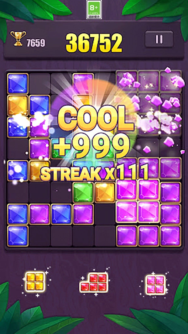 2. 这款游戏操作极其简便,玩家仅需触摸屏幕,把方块拖至宫格内,当一行或者一列被铺满时,便能实现消除。