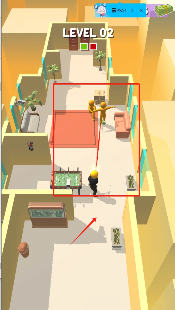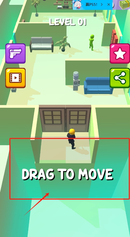 1. 房间门口站着一个戴着黄头盔的小人,屏幕左上角有个紫色枪的图标,点击它可以进行射击操作。屏幕右上角的星星图标,推测可能代表着奖励。通过拖动屏幕,能够改变视角。游戏的目标是成功消灭敌人,从而赢取PS5。
