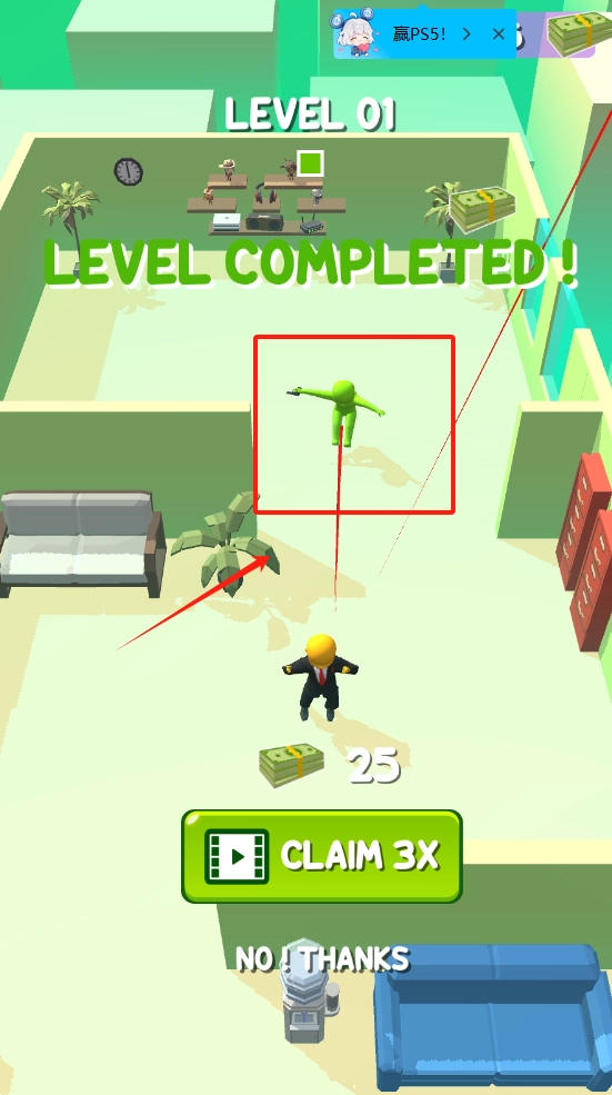 2、黑衣小人的脚下放着钱袋。点击绿色的“CLAIM 3X”按钮,就能领取3倍奖励;若选择“NO THANKS”,则表示放弃。在右上角,还能看到PS5广告以及钱币图案。