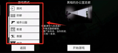 2、挑选游戏模式:于游戏模式选择界面处,左侧设有多个模式供您挑选,其中涵盖“房间”、“防御”、“城市公园”、“街道”、“救援”以及“挑战”。