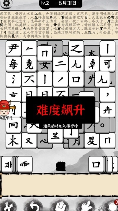 3、难度遵循循序渐进原则,从基础的偏旁部首开始,逐步过渡到复杂的字形,这种设置充分考虑到不同水平玩家的需求,无论是新手还是有一定基础的玩家都能获得良好体验,同时具备趣味性与学习性。