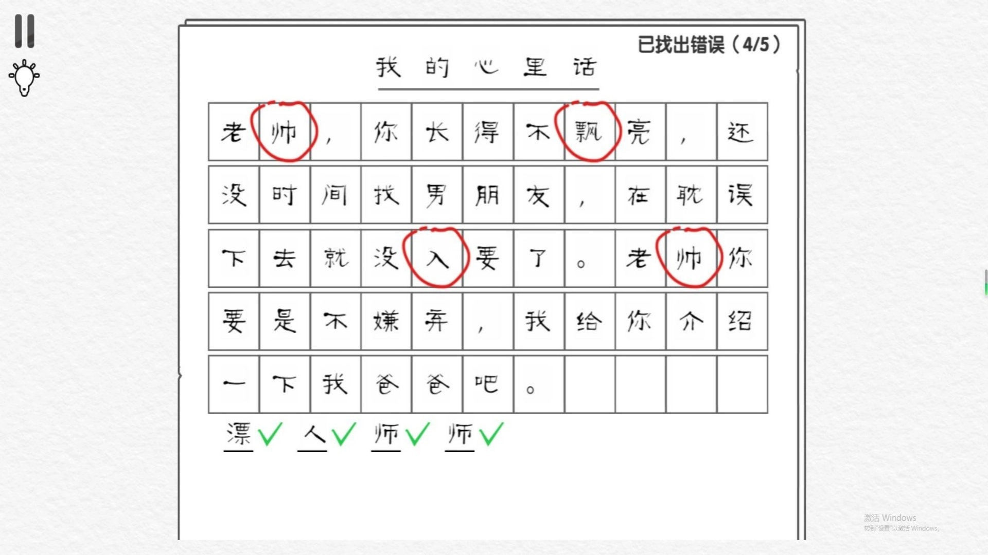 3. 玩家需通过点击屏幕找出错字并改正,只有全部找对,才能通关并获取评分。