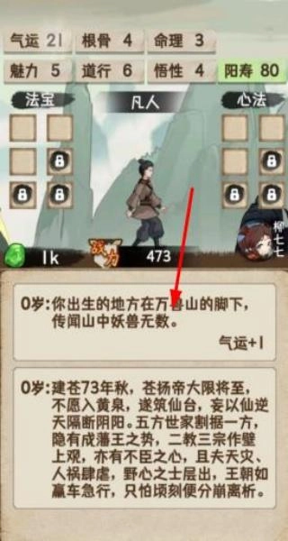 1. 开启角色创建,选择凡人出身,比如商人世家可获得金币支援,亦或是平民开局,接着分配初始属性点与道心值,就此踏上修仙之旅。