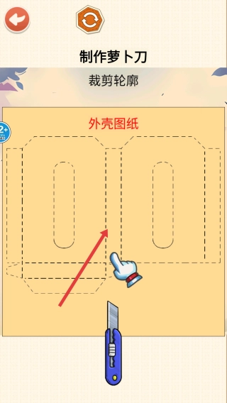 3、制作操作:按提示“裁剪轮廓”,用工具(如蓝色小刀)沿“外壳图纸”虚线裁剪,完成手工制作步骤。