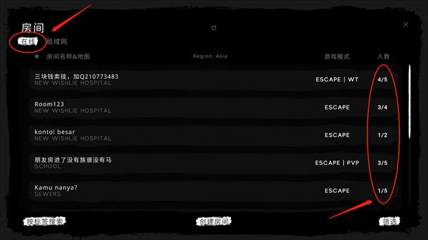2、在【房间】界面里,能够看到其他玩家创建的房间,随意点击其中一个房间,就能和其他游戏玩家一同尽情游玩。