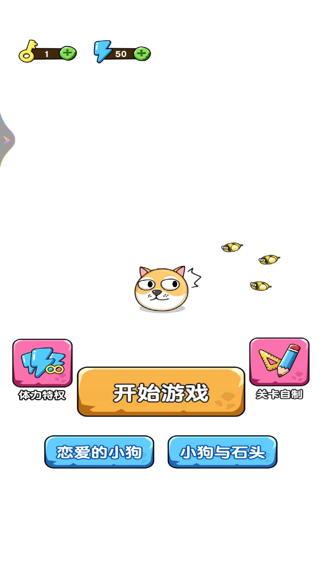 可爱角色设计:狗头造型憨态可掬,表情生动多变,搭配蜜蜂的趣味动画,提升游戏的趣味性与沉浸感。