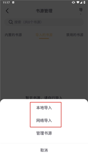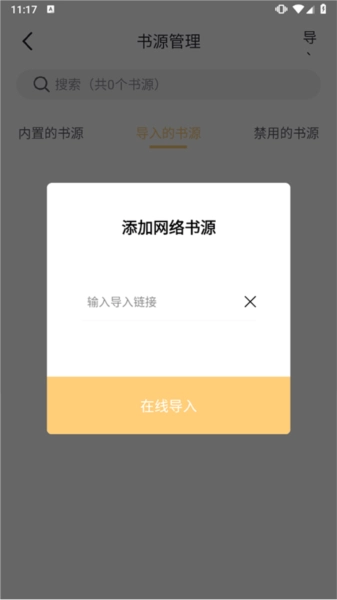 4、比如进行网络导入,只需将书源网址粘贴到对应的框内,然后点击在线导入就行。