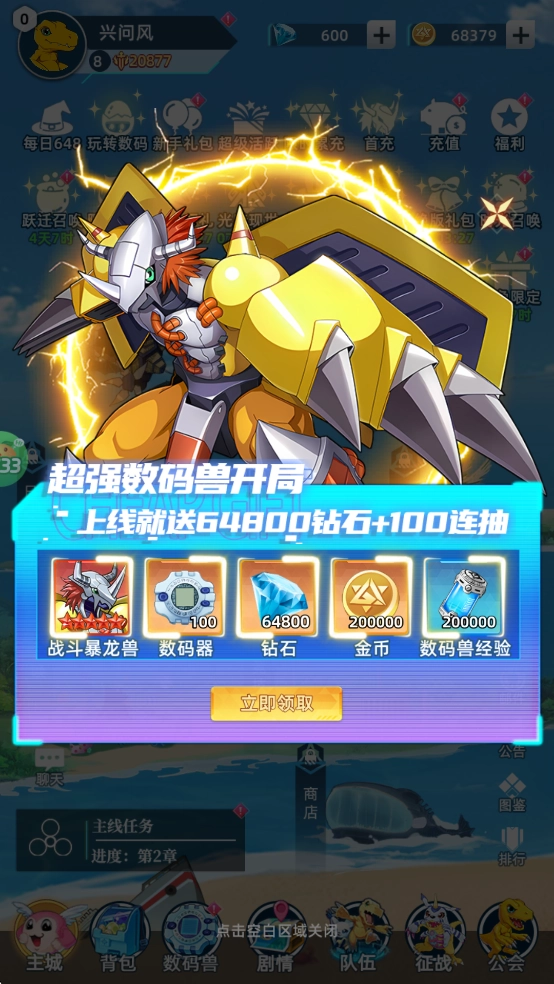6、畅玩数码世界,究极体的钢铁海龙兽、凤凰兽、蔷薇兽、维京兽以及科学怪兽通通免费赠送!