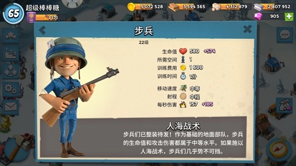 (1)步兵:占据登陆艇1个位置,攻击距离相较于胖子稍远,移动速度较快,伤害中等。