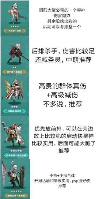 来讲讲起大狙和起双冥存在的问题。大狙在前期PVP中玩起来很畅快,但到了中后期,由于大家星魂抗性提高,它就开始“还债”了,而且在推图方面也没什么优势,所以现在已经不建议选用。双冥呢,因为羁绊的缘故,必须同步培养,培养速度慢,并且对练度要求较高。在前期无论是PVP还是PVE,双冥都不占优势。后期肯定是要练的,但要是在前期就劝人白嫖练双冥,那简直就是坑人。