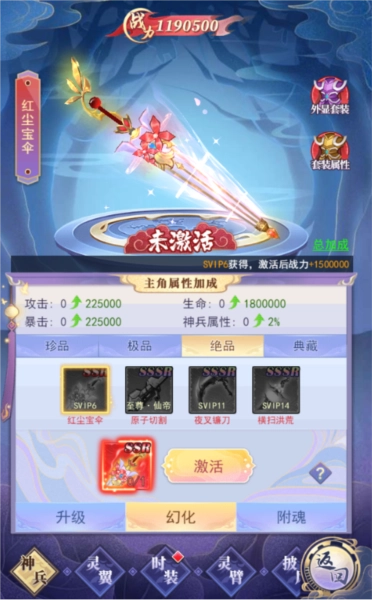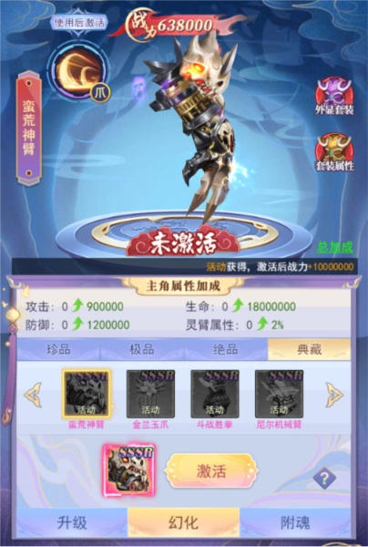 灵臂幻化,即通过消耗对应的激活卡获得相应属性和外观,此外还会有专属的外观技能,诸如群攻、加攻、额外加伤 等等。