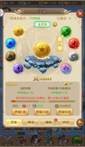 如图可见,灵珠总计8种,分别为金、木、水、火、土、风、雷、魂。具备pvp、pve、伤害、爆伤等属性增益类型。激活一颗灵珠需要30个碎片,对灵珠进行升级能够提升属性增益效果,从而带来可观的战力加成。