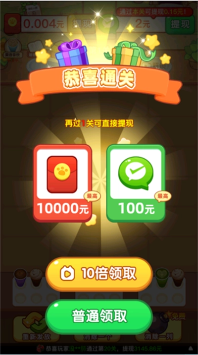 8、提现存在两种方式,其一为成功通过指定关卡后,即可直接进行提现操作。
