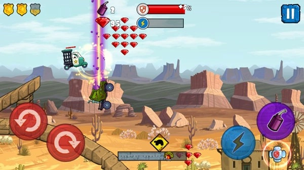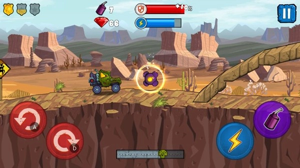 就游戏玩法而言,整体较为简单。其中,左侧主要用于操控赛车重心,右侧则以加速及释放炸弹为主。此外,关卡内设有大量障碍与独特的道路设计,使得每一关都独具特色。