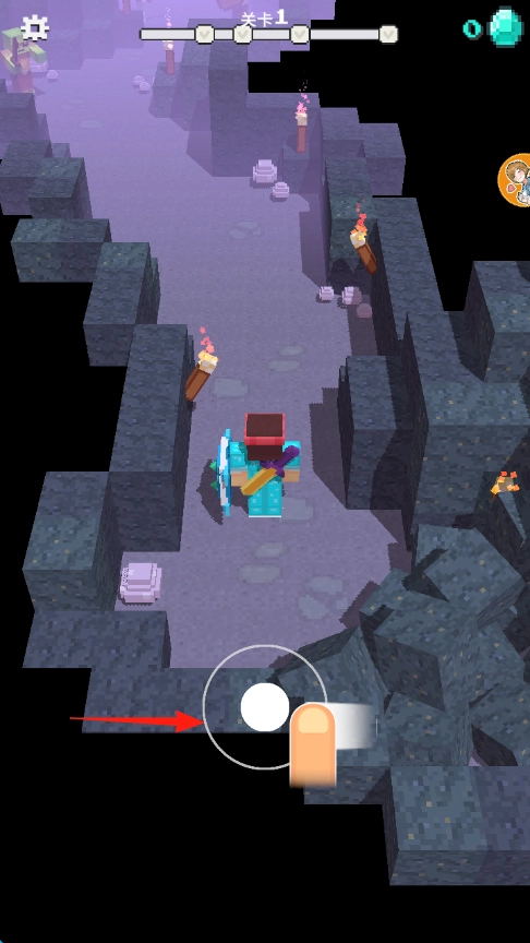 1、在关卡1的地牢中,点击移动按钮,【操控角色顺着通道前行】,对未知区域展开探索。
