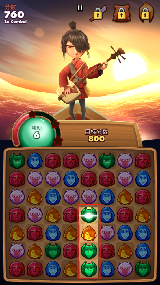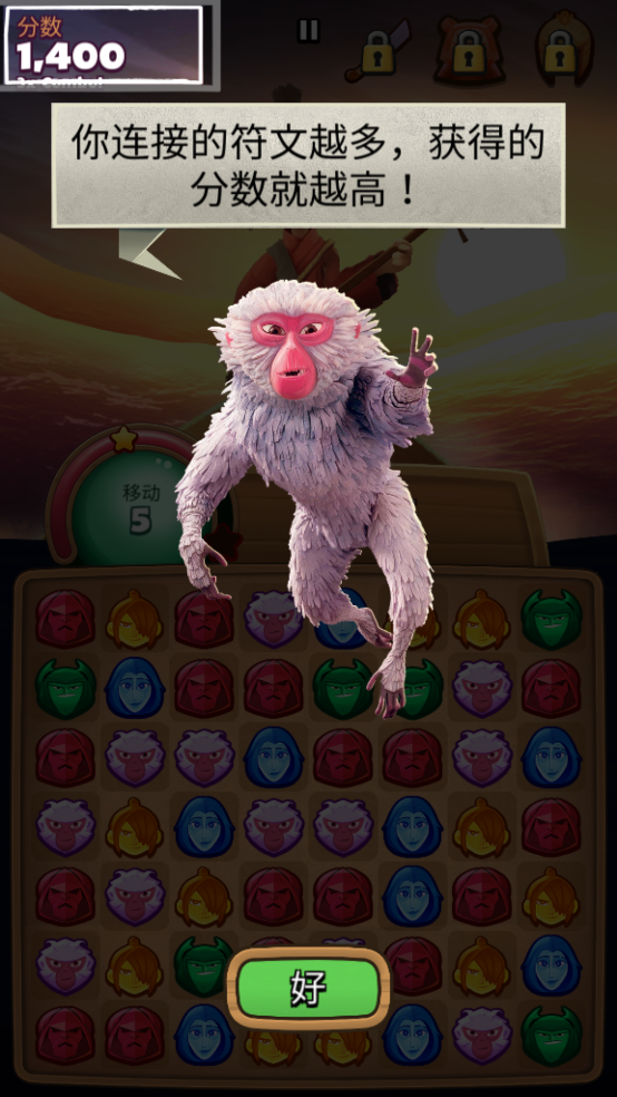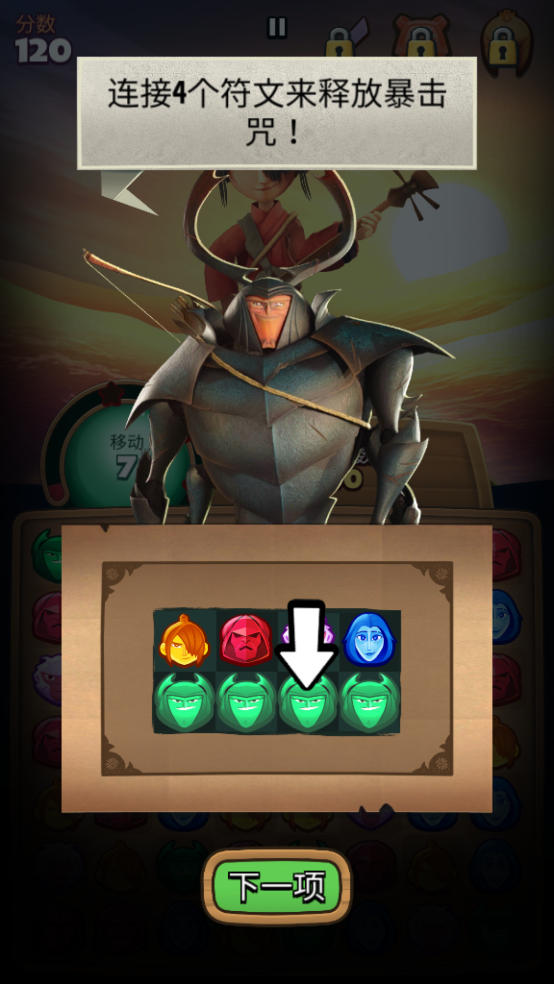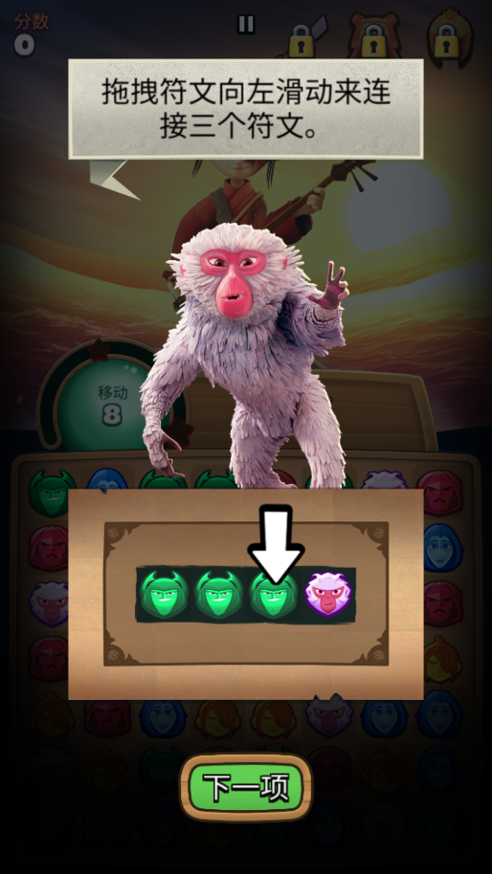 1. 通过挪动符文,使三个符文形成连接从而实现消除。