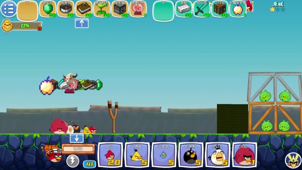 5、玩法与愤怒的小鸟相近,通过发射小鸟并调整角度,把所有小猪都摧毁。