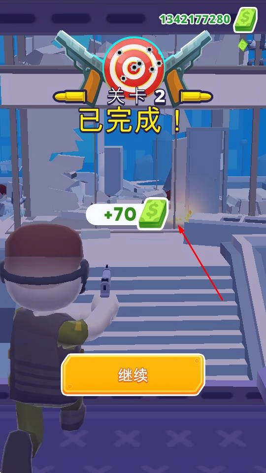 3、当成功通过关卡,界面将显示“关卡2已完成”,同时玩家可获得金钱奖励,点击“继续”即可进入下一关。
