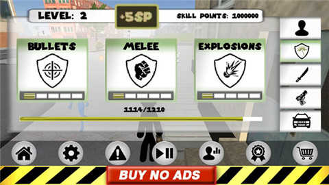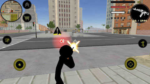 在游戏中,左侧操作可实现移动与加速,右侧负责绳索操控、攻击(含跳跃攻击)以及单纯的跳跃动作。右上侧设有武器更换区域,同时血量与经验的显示会实时更新,清晰明了。玩家能凭借自由多样的玩法,与其他帮派人物展开交火。在交火过程中,成功击杀敌人可获取经验,击杀数量累积到一定程度会产生星级。一旦星级出现,警察以及周边其他角色便会格外“关照”你,对你发起猛烈进攻。此时,如何在枪林弹雨中存活下来,又怎样将其他人物成功击杀,就成了你必须完成的任务。