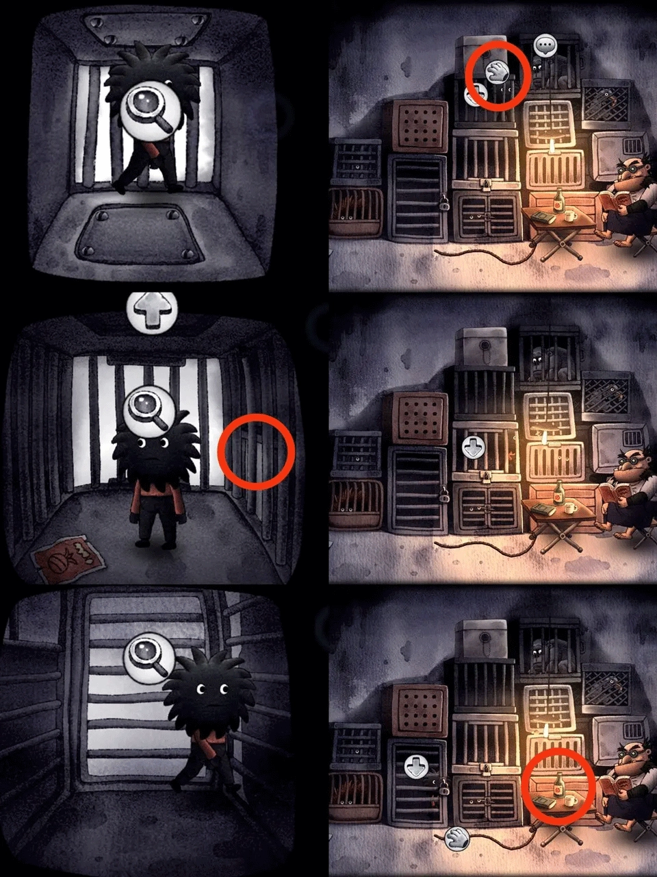 5、接着切换至放大镜视角,回到外部区域,点击灯光,用铁管将灯敲灭。待灯熄灭后,看守者便会离去。