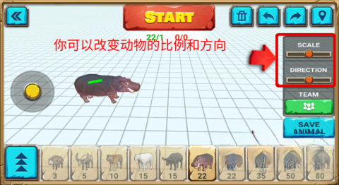 5、借助右侧的SCALE和DIRECTION,能够改变动物的大小以及行动方向。