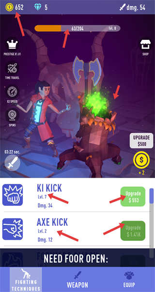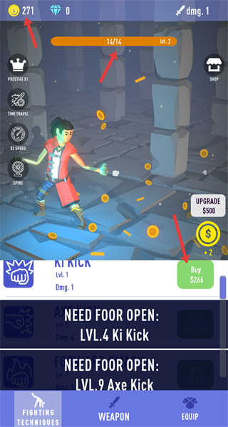 4、除了购置武器,还能够对现有的战斗技能进行升级,通过消耗金币来提高技能等级,进而增加技能伤害,使角色在战斗中占据更大优势。