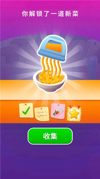 5、成功通关后,能够解锁新菜品,还会获得更多道具,诸如刀具、盘子、食材等应有尽有。