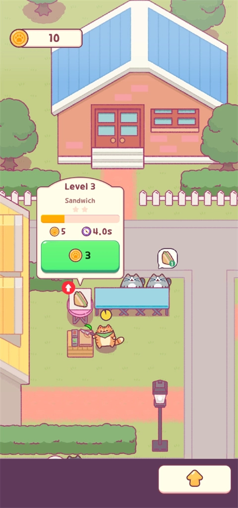 点击页面下方那个醒目的黄色箭头图标,通过这个入口你能获得一只可爱的猫咪伙伴,它还能协助你完成三明治的制作过程。