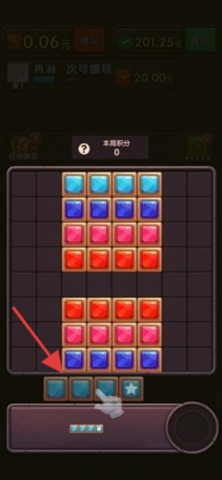 进入消除界面后,底部会显示方块道具,你可以将其拖动到上方的棋盘区域,与相同颜色的宝石拼接在一起就能完成消除,这样就能获得积分,进而推动提现进度的前进。