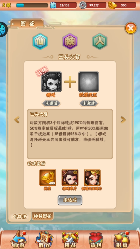 哪吒与托塔天王一同作战时,会由哪吒发动技能,对敌方三个随机选定的目标造成相当于自身攻击力1.9倍的物理伤害,其中半数目标可能陷入1秒的眩晕状态;此外,该技能还有一半几率触发特殊效果,让受击目标的命中率暂时下降一成半。