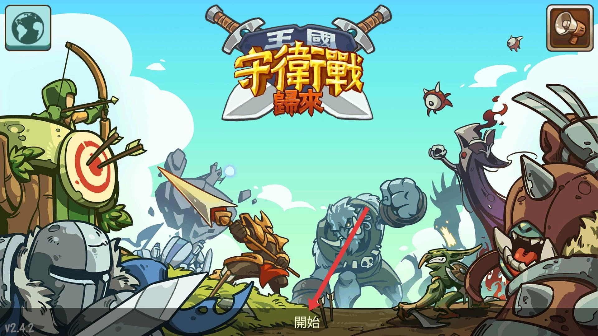 安装《王国守卫战:归来》这款游戏,点击游戏启动界面的“开始”按钮,进入关卡后,即可开启防御战斗。