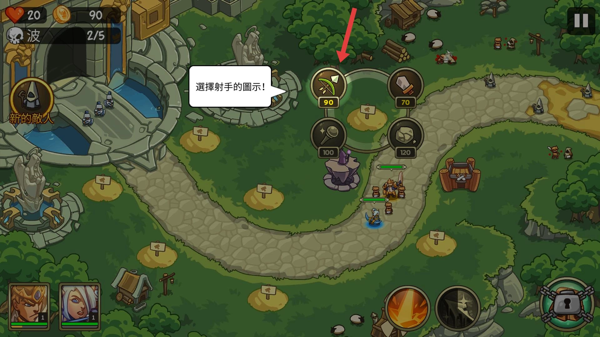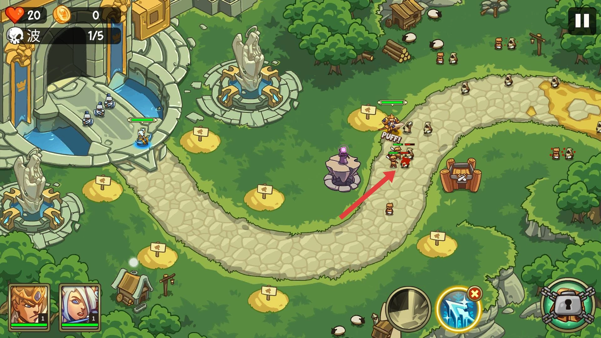 在第一关里,你要操控已经布置好的防御单位,抵御顺着路径进攻的敌人,保卫城堡。