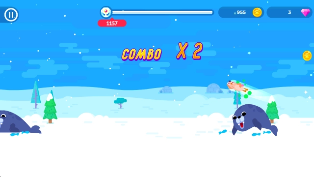 之后企鹅便会飞出来,在它下落的时候点击屏幕,能让企鹅加速坠落,只要落到其他动物的肚子上,就能触发弹射效果。