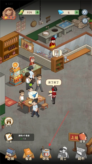 在面馆的主界面,点击底部的研发按钮,进入新品研发页面,这样就能更新面馆的菜品,丰富可提供的餐食种类。