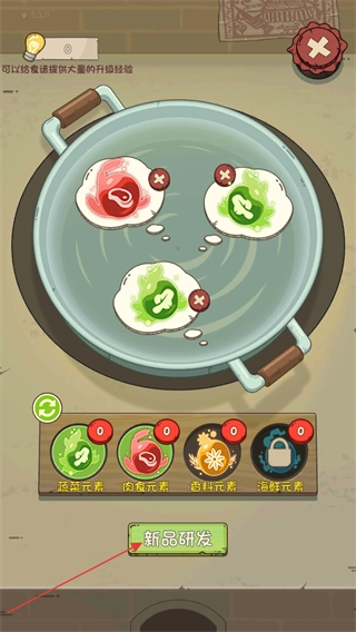 在研发界面选定对应元素后,点击新品研发按钮,通过尝试制作新菜品来丰富面馆的菜单选择,从而增强经营的多样性。