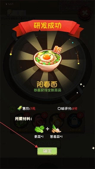 研发成功后会解锁新菜品阳春面,点击界面上的确定按钮,即可把这道菜品添加至面馆的可售卖菜单里。