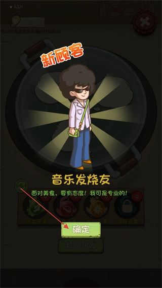 随着新菜品的研发,会吸引到新类型的顾客——音乐发烧友。点击确定按钮即可完成该类顾客的解锁,之后便能接待这类顾客,从而为面馆增添新的营收渠道。