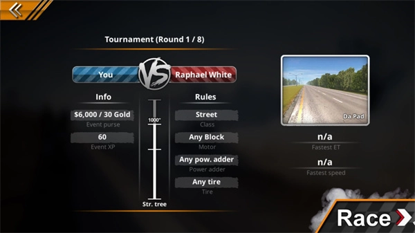 从列表里选好具体赛道,点击“Race”按钮就能开启比赛。